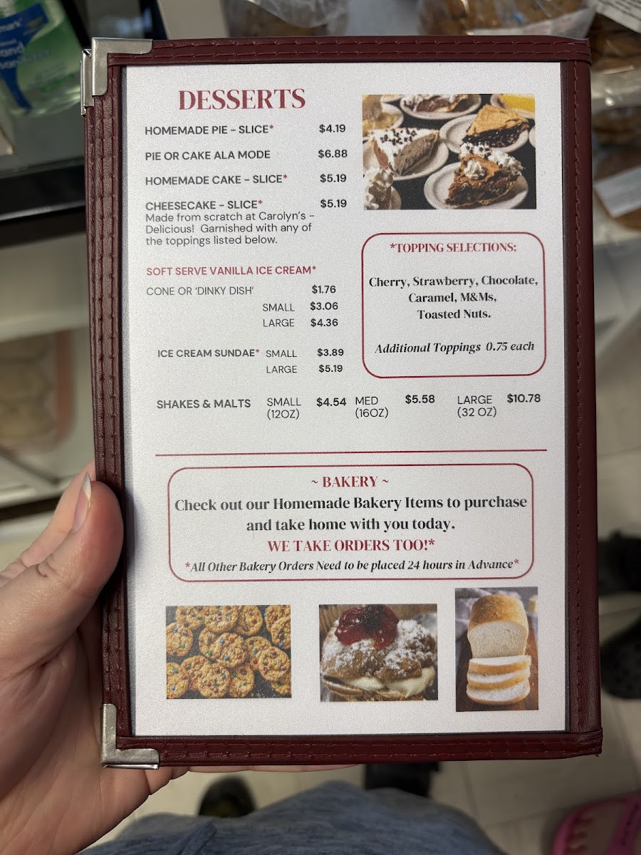 For dessert lovers, Carolyns doesn't disappoint. Their selection of whole cakes, including the rich Hot Fudge Cake at $12.00, is a must-try.